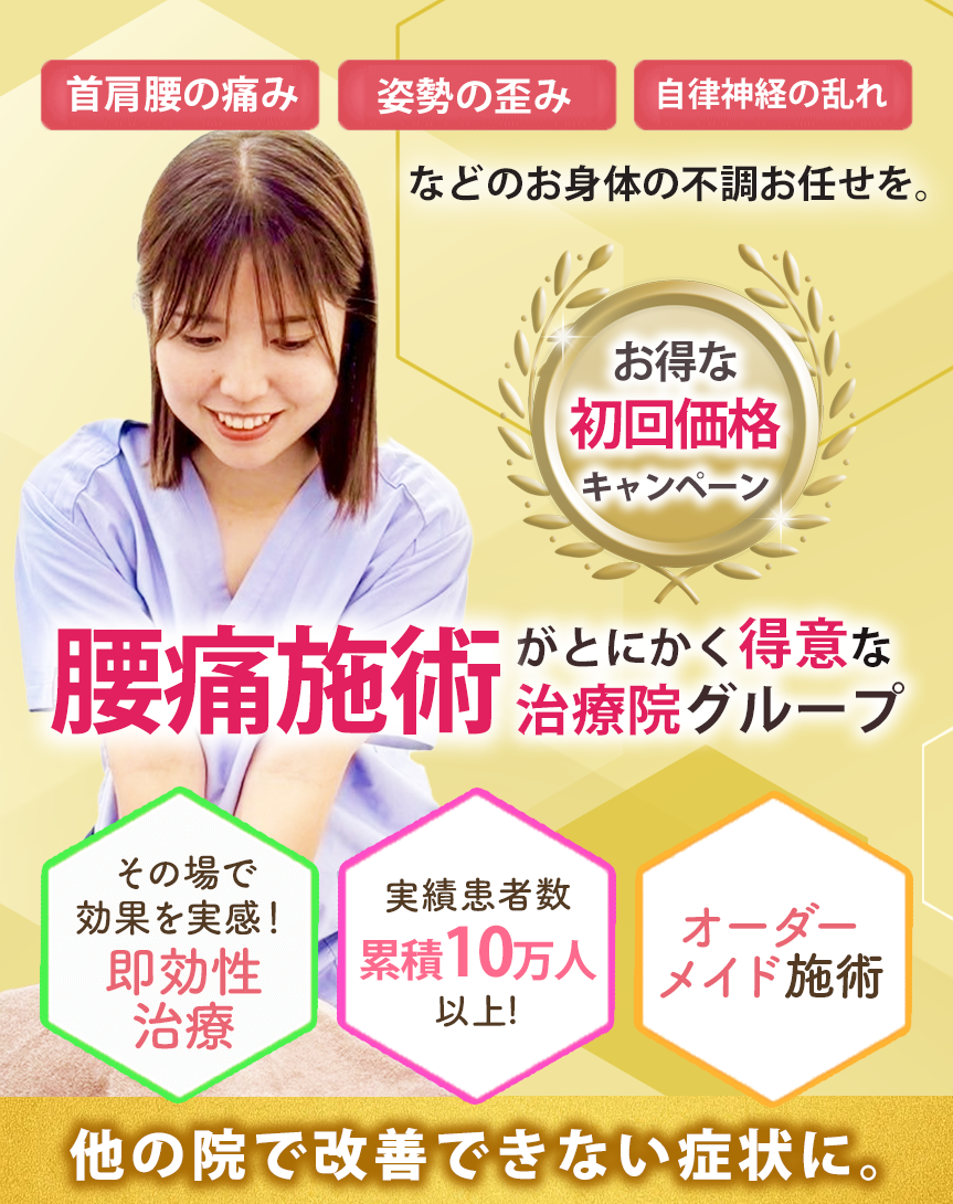 当院にご興味を持っていただきまして誠にありがとうございます。栄光治院グループは愛知県に根付いた、国家資格者が施術を行う整体院グループです。他の治療院やクリニックなどで改善しない症状・不調をお持ちの方が、根本改善を求めて多数ご来院いただいております。そんな当院が選ばれる理由についてご説明いたします。